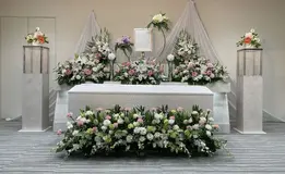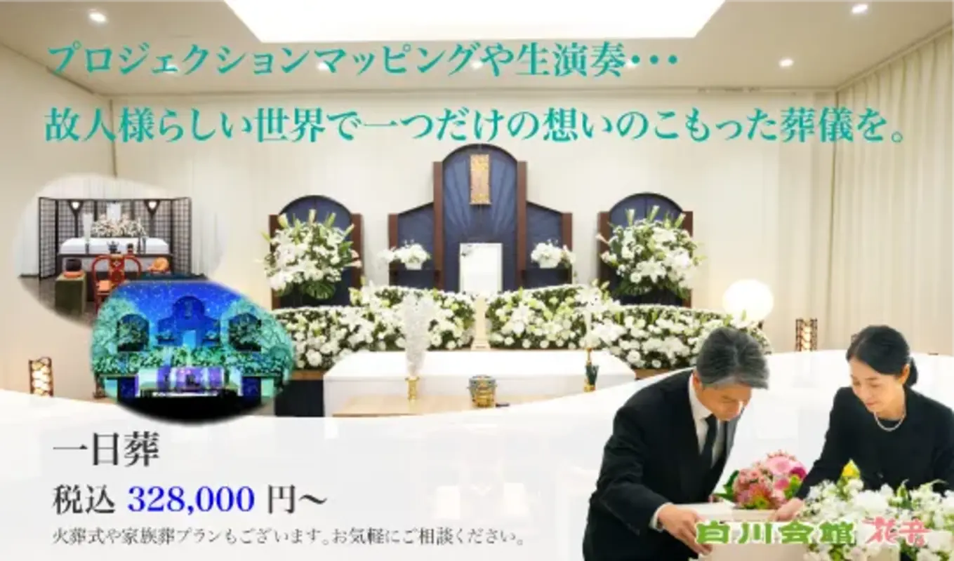 白川会館 花音は、ご要望に沿って作成する生花祭壇や、プロジェクションマッピングを用いた演出、プロ奏者による生演奏など、故人様らしさを表現したご葬儀が可能です。 大切な方を偲ぶ想いが深まる、世界に一つだけのご葬儀をお約束いたします。 参列者の皆様が、心に残る感動と癒しを得られるよう、心を込めてお手伝いいたします。
