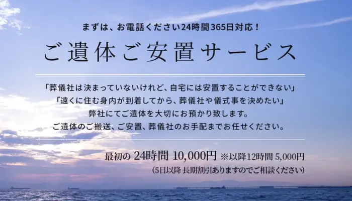 24時間365日対応 ご遺体のご移動やお預かりだけでもご利用いただけます。