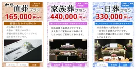 料金 | 直葬・火葬式 :¥165,000〜(税込) 家族葬 :¥440,000〜(税込) 一日葬 :¥330,000〜(税込) 一般葬 :¥880,000〜(税込) |