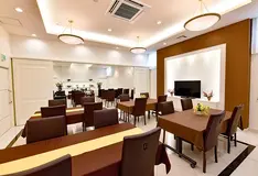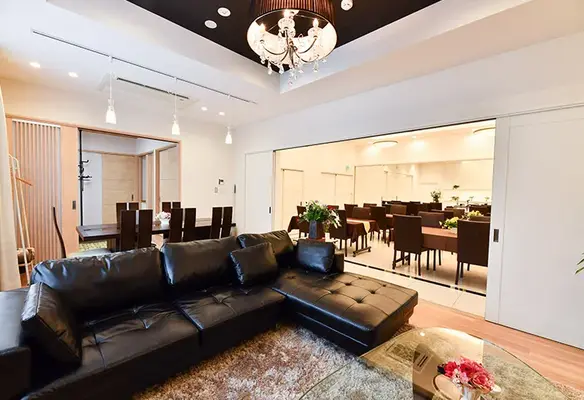 控え室は、明るくカジュアルな雰囲気に仕立て上げました。可愛らしいお花のアレンジメントがお部屋を彩り、式場内のソファーやテーブルなどの内装はモダンなデザインに統一されております。和室と洋室の両方をご用意しておりますので、まるでご自宅のように落ち着いた空間で、ご葬儀までの間ゆっくりとおくつろぎ頂けます。