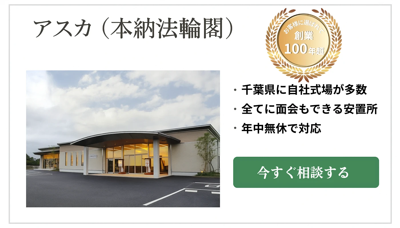 アスカ(本納法輪閣)は、1985年に創業した葬儀社です。千葉県に多数自社式場を運営。その全てに面会もできる安置室を完備しています。ココなら故人に会いに行きやすい安置室が、あなたの自宅近くに見つかります。