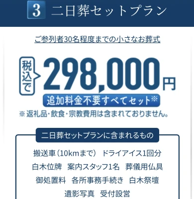 | 料金 | 直葬・火葬式 :¥88,000〜(税込) 一日葬 :¥198,000〜(税込) 家族葬 :¥298,000〜(税込) 一般葬 :¥298,000〜(税込) |