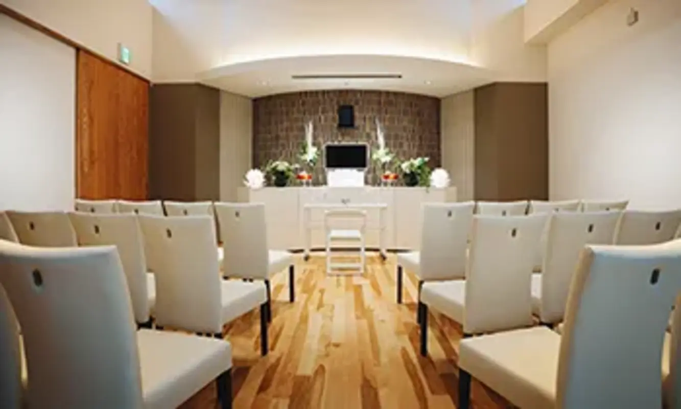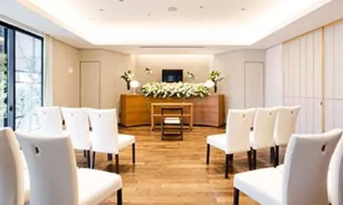 「月心会館・余土」は、約60名までの家族葬から中規模なお葬式に最適な会館です。館内で過ごしていただくご家族の皆様のくつろぎを最大限に考慮し、落ち着いた内装はもちろん、通夜室(さくらの間)には広々としたリビングはもちろん、キッチンやベッドを完備した寝室を併設するなど、まるでホテルで過ごしていただくかのように快適に過ごしていただける会館です。
