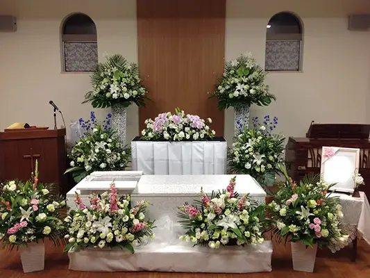 429,000円〜通夜は行わず、一日で葬儀・告別式を行う少人数プランです。 他社と比べてもよりたくさんの生花で故人様をお送りすることができます。 また、祭壇の花は全て棺に収めることができます。 ※1泊22,000円(税込)でご宿泊いただけます。 ※ドライアイス・安置料は亡くなった時間によって料金が変動します。 ※霊柩車・寝台車の料金は距離によって異なります。 ※人数が大幅に超過する場合、スタッフの増員が必要となり、それに伴う別途費用が発生いたします。