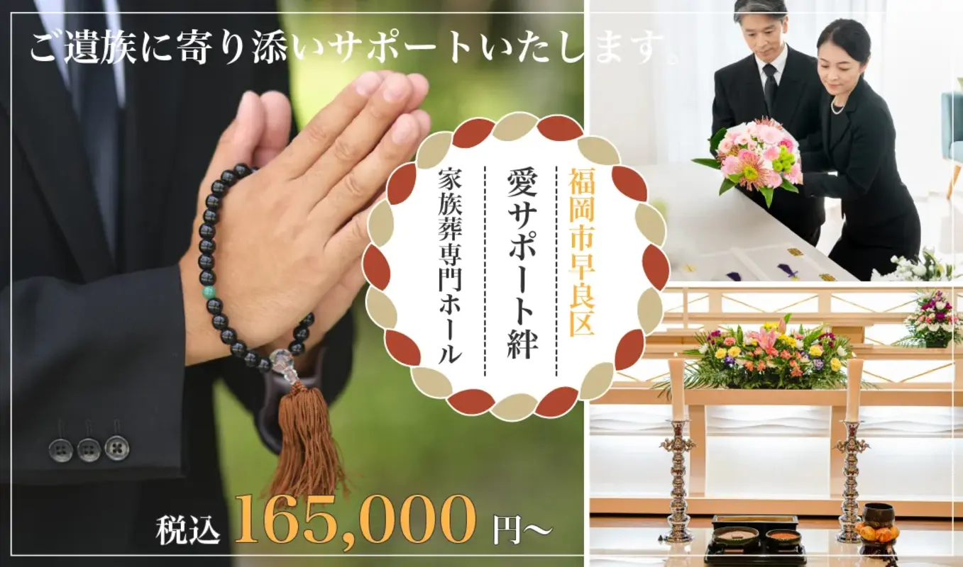 「愛サポート絆」は、福岡市早良区を中心に福岡全域の家族葬をお手伝いする葬儀社です。葬儀社主導の提案ではなく、ご遺族の意向を最大限に葬儀に取り込めるようアドバイス・サポートいたします。福岡で家族葬など小さなお葬式の事なら、ご家族の想いを大切にする愛サポート絆にお任せください。