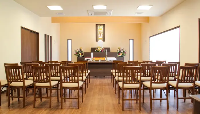 「高須会館」は一日一組限定の貸切りでご利用いただけます。最大60名様以上収容可能のバリアフリー対応大ホールは、家族葬にピッタリ。完全プライベートな空間で、大切な故人と最後の時間をお過ごしください。