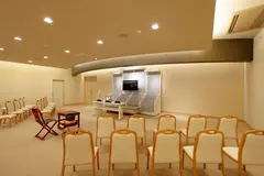 自社式場「かずやコスメディア 家族葬ホール銀水」は一日一家族限定の貸切りでご利用いただけます。収容人数は50名程で家族葬にピッタリ。完全プライベートな空間で、故人との最後の時間をゆっくりお過ごしください。