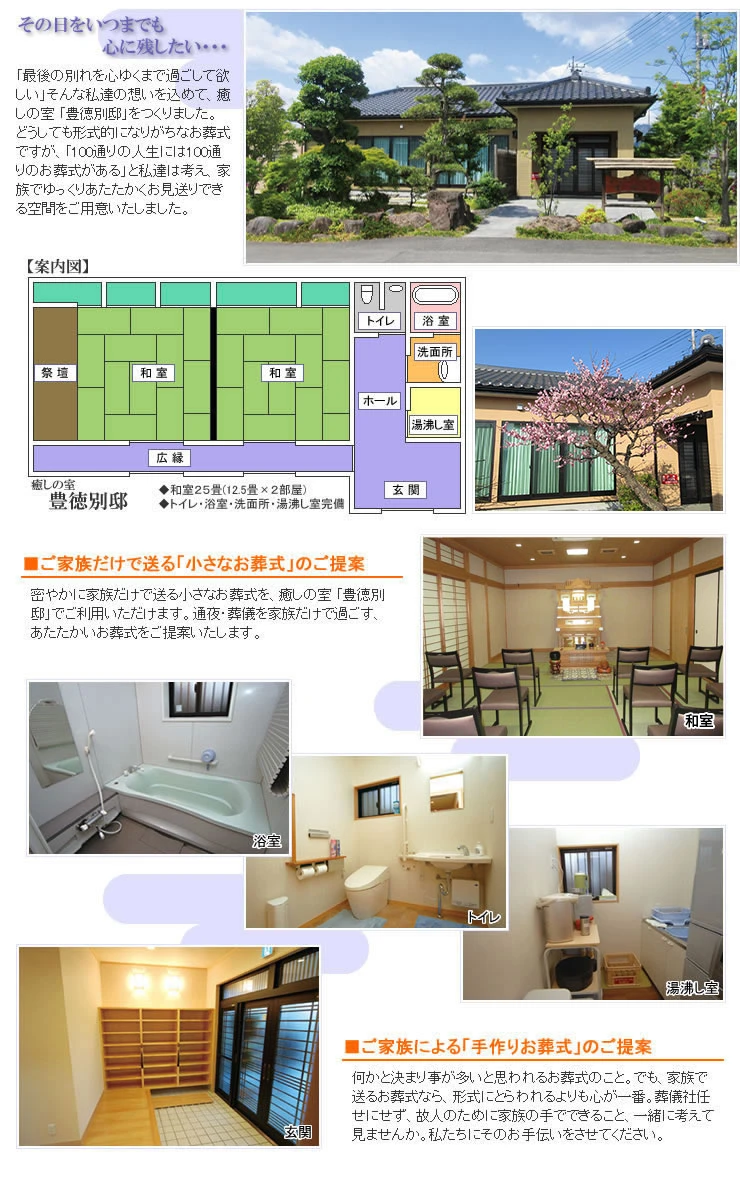 豊徳別邸は、各宗教・宗派の「火葬式・一日葬・家族葬・一般葬」などの葬儀に対応できる安中市の葬儀社です。