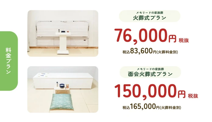 165,000円〜葬儀は行いませんが、仏具なども含まれ、ご希望により宗教者によるお別れの儀式を行えるプランです。 ※無料会員にご登録いただいた際の金額となります。