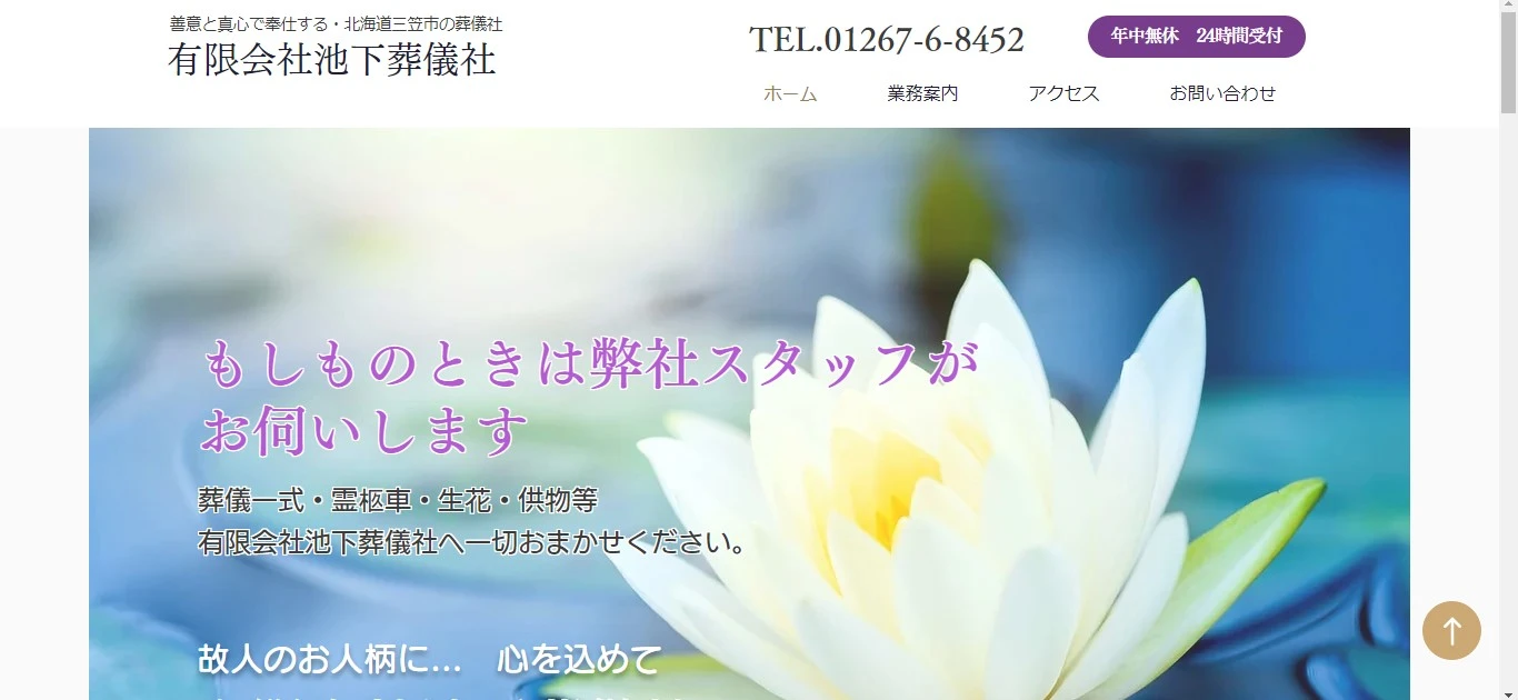 有限会社池下葬儀社は三笠市に密着した葬儀社です。24時間365日、お迎えも事前相談にも対応しています。