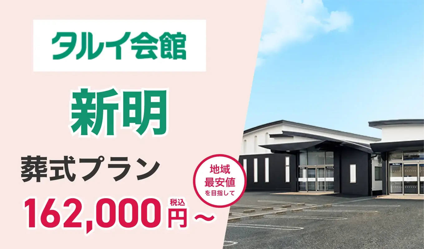 「タルイ会館 新明」は明石市新明町にある葬儀場です。明石市周辺地域で半世紀以上にわたり、葬儀・家族葬をお手伝いしてきました。事前相談から葬儀の打ち合わせ、当日、相続などや遺品整理のアフターサービスまで全てプロのスタッフにお任せください。