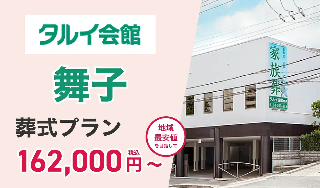 「タルイ会館 舞子」は神戸市垂水区舞子坂にある葬儀場です。神戸市垂水区を含む明石市周辺地域で半世紀以上にわたり、葬儀・家族葬をお手伝いしてきました。事前相談から葬儀の打ち合わせ、当日、相続などや遺品整理のアフターサービスまで全てプロのスタッフにお任せください。