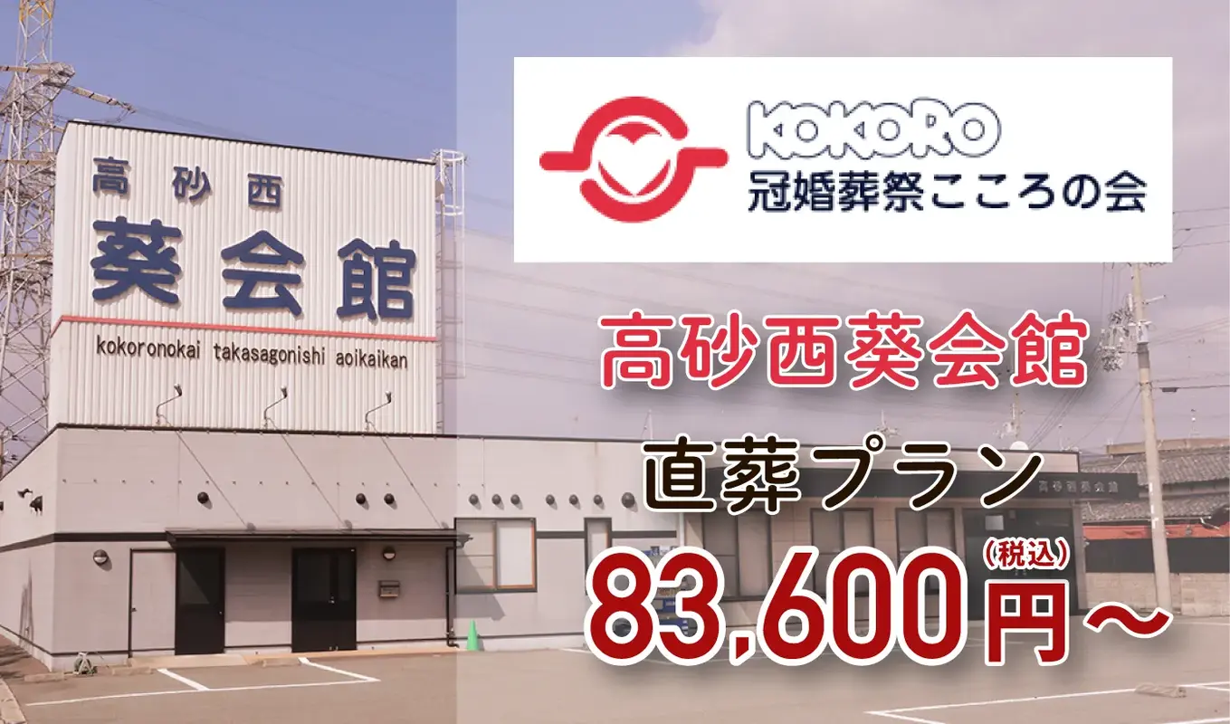 高砂市で直葬・火葬式をする場合のオススメの葬儀社は、高砂市中筋5-17-337-1にある「こころの会(高砂西葵会館)」です。