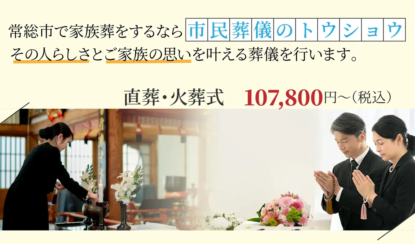茨城県常総市で家族葬をお考えの方はトウショウへ。事前のご相談からご葬儀のあとまで、誰よりも安心してお話しできる存在となることをモットーとしています。 葬儀の時間は不安がつきものです。そんなご家族の不安を解消して差し上げることが私たちの仕事です。もちろん事前のご相談から、その後の相続や手続き関係、介護のことまで。私たちは安心サポートに全力を尽くします。