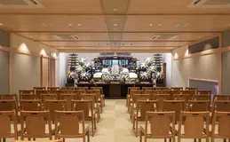 和をイメージした平屋のホールです。式場は一式場で小規模の家族葬から一般葬まで行える式場となっております。親族間のプライベートにも配慮した和洋室の親族控室を完備しておりますので故人様とゆっくりと過ごせるお部屋となっております。