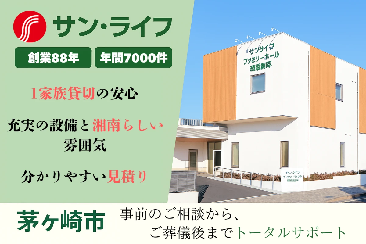 茅ヶ崎市常盤町にあるファミリーホール湘南海岸を運営する「サン・ライフ」は、創業88年の老舗葬儀社です。 創業以来、神奈川・西東京エリアで数多くの葬儀を手伝ってきました。誠実で丁寧な対応に各地域の方々から信頼され、年間7000件もの葬儀を行っています。