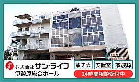 伊勢原市串橋にある伊勢原総合ホールを運営する「サン・ライフ」は年間7000件もの葬儀を行う、大手葬儀社です。 火葬のみ、一日葬、家族葬、一般葬など様々な葬儀に対応してきた経験をもとに、あなたの希望の葬儀を実現してくれます。