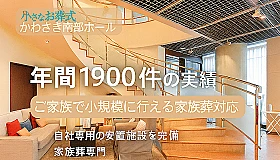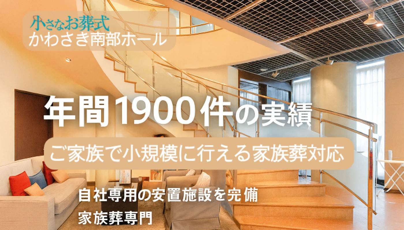 小さなお葬式 かわさき南部ホールは小規模な家族葬に特化した家族葬専用式場です。 ご家族のみで行う火葬式から30名規模のご葬儀まで対応致します。 川崎区でのお葬式をご希望の方は、是非お問合せください。