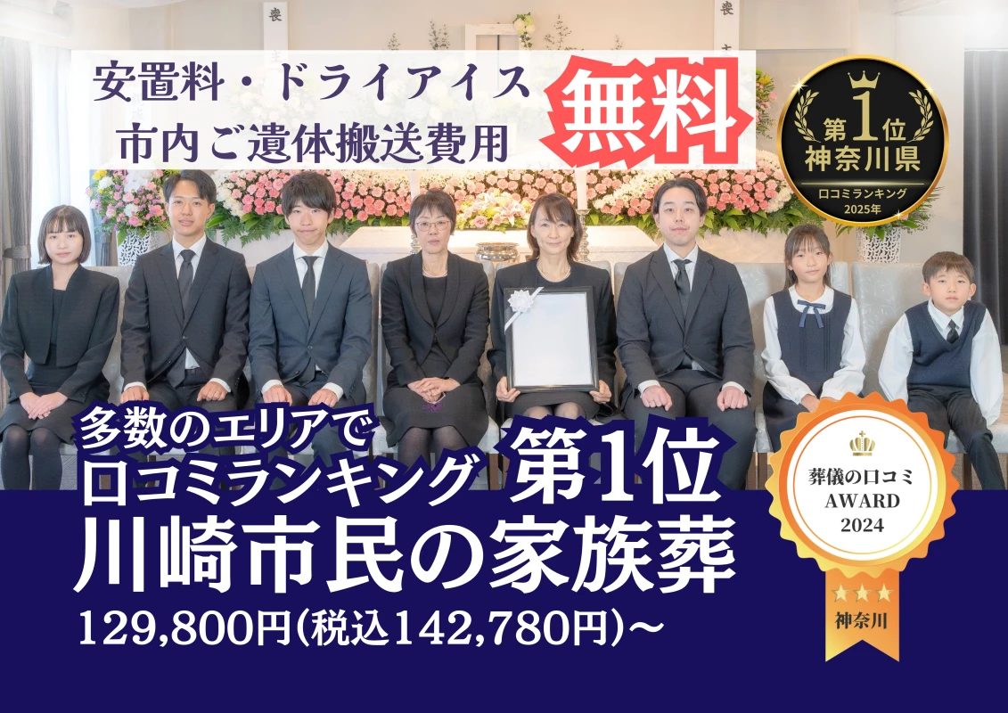 ▶〈川崎市営斎場〉での家族葬専門。 ▶市民であれば市営斎場を市民価格でご利用可能! ▶費用や流れなど葬儀のお悩みを解消いたします ▶ケアマネージャーや医師、看護師からの依頼も多数あり ▶お葬式がはじめてでよくわからない方に丁寧にご説明いたします ▶女性 葬儀相談スタッフ在籍 ▶葬儀に必要なものを含んだプランをご用意
