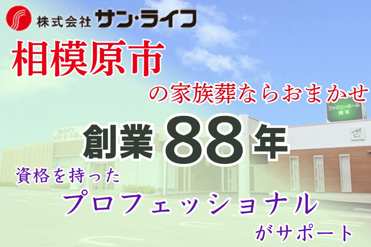 サン・ライフ(橋本総合ホール)は、1933年に創業した老舗葬儀社です。神奈川・東京に多数の自社式場を運営していて、全ての自社式場に安置室を完備。自宅に安置できない方にとってもオススメです。