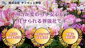 「サンセット葬祭」は最初にお電話頂いてから葬儀後のアフターフォローまで担当が変わらないワンストップ運営を行っております。途中で担当者が変わらなく引継ぎが無いので打ち合わせがスムーズです。 ※良くある→本日担当の○○はお休みを頂いてます。や、あれっ、昨日の○○さんに言ったのに。が無い。 また、式中の司会進行、ご案内は全て女性のエキスパートなので、女性ならではの柔らかい対応でご遺族の方に安心をご提供いたします。