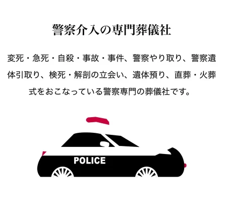 警察専門の村岡葬研葬儀社は、警察が介入する特殊な状況での葬儀に特化。ご遺族が直面する警察とのやり取り、遺体の引き取り、検死・解剖の立ち会い、遺体預かり、直葬・火葬式まで、専門的なサポートを提供します。