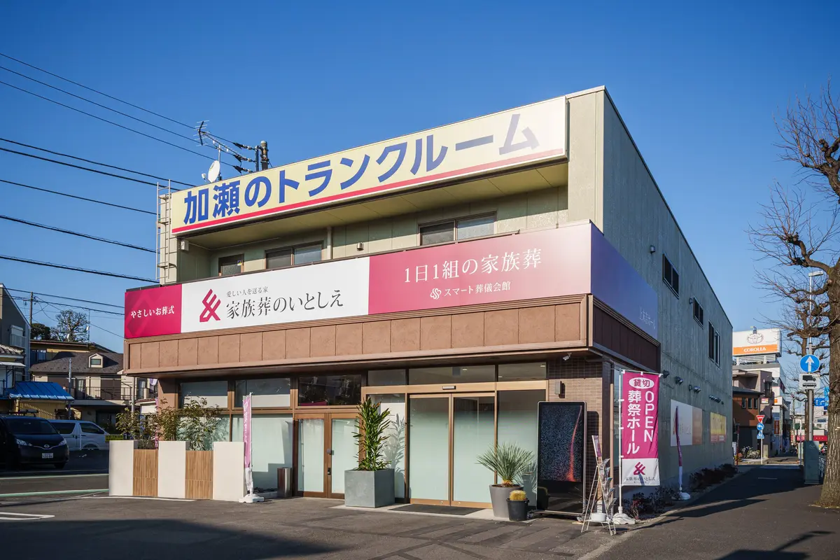 「家族葬のいとしえ上末吉ホール」は横浜市鶴見区上末吉にある斎場(葬儀場)です。自宅で葬儀が出来ない家族が増えている近年、家族葬専用の斎場として作られました。葬儀は一日一組限定。最後のひとときまで、家族だけの空間で過ごすことが可能。安置室もあるので、自宅に帰らせてあげられない方も安心です。