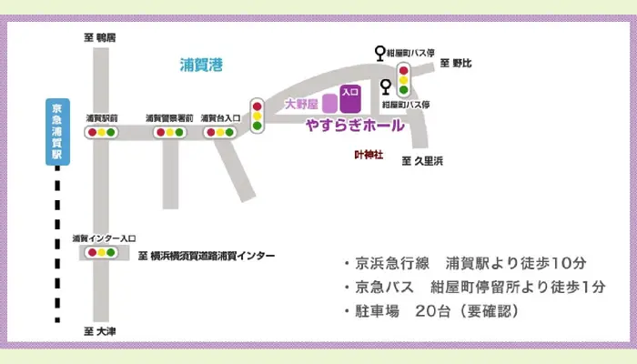 浦賀大野屋葬儀社(やすらぎホール)へのアクセス方法は下記の通りです。