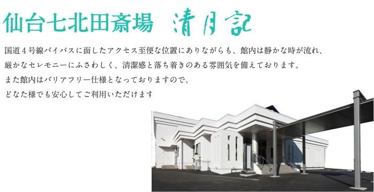 清月記/仙台七北田斎場清月記は、各宗教・宗派の「火葬式・一日葬・家族葬・一般葬」などの葬儀に対応できる泉区の葬儀社です。