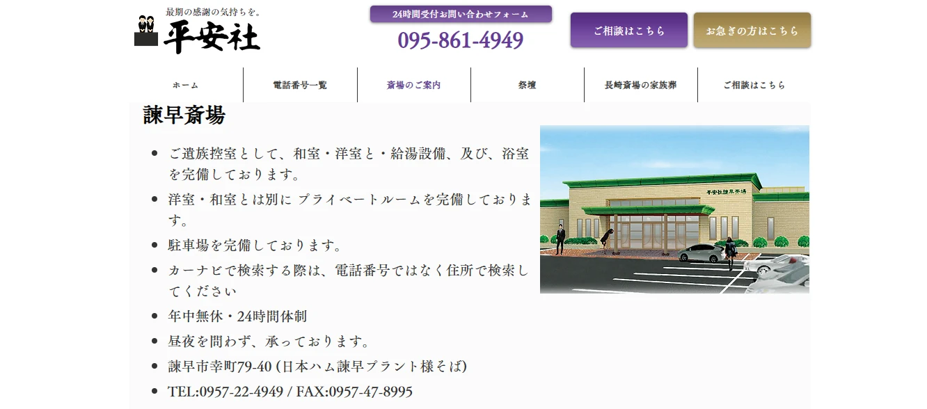 平安社は諫早市に密着した葬儀社です。24時間365日、お迎えも事前相談にも対応しています。