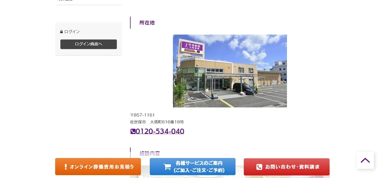 A. 大塔インターより国道35号線を佐世保市中心部へ300mほど行ったところの道路沿いにあります。紫色の看板で法倫會館 大塔斎場と大きく出ているので非常に分かりやすいです。初めての地で深夜に到着した私たちでもすぐに見つけることができました。お通夜の際、案内された和室は4人分の布団が敷けるくらいのスペースの部屋でした。冷蔵庫、エアコン、テレビ、トイレ、シャワー室がありました。立地が街中なので夜でも寂しくなく過ごすことができました。