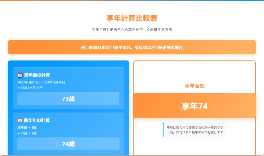 享年は数え年で計算するのが一般的で、満年齢+1または+2で表されます。計算方法は以下の通りです:誕生日を迎える前に亡くなった場合は満年齢+2歳、誕生日を迎えた後は満年齢+1歳となります。