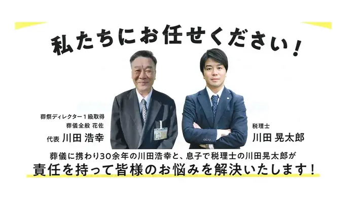 葬儀に携わり30年余年の川田浩幸と、息子で税理士の川田晃太郎が責任を皆様の持ってお悩みを解決いたします。