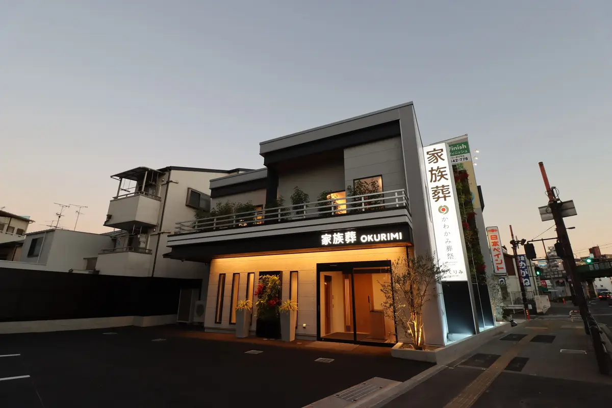 家族葬ホールおくりみはJR大和路線東部市場前駅より徒歩5分。駐車場、シャワー、ベッドルーム完備。館内の設備はホテルのように充実しており、小規模から中規模まで対応できる式場となっております。お越しになられた皆様に最高のお見送りの空間を提供いたします。壁面やバルコニーにたくさんの緑が目を惹く、葬儀ホールです。