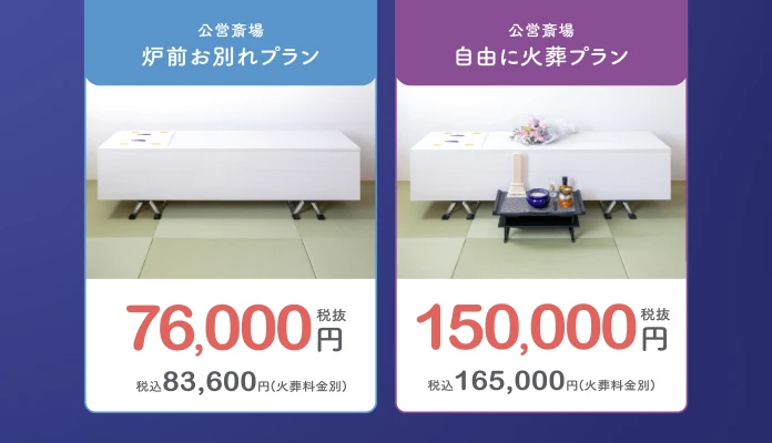 | 料金 | 直葬・火葬式 :¥83,600〜(税込) 直葬・火葬式 :¥165,000〜(税込) 家族葬 :¥222,000〜(税込) |