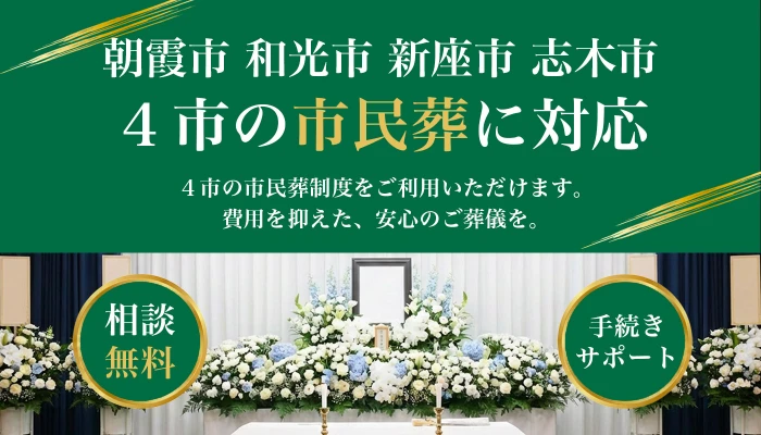 439,250円〜朝霞市による朝霞市民葬制度(仕様2)を利用し 弊社の式場にてお通夜を省略したプランです。 家族葬での利用が多いです。