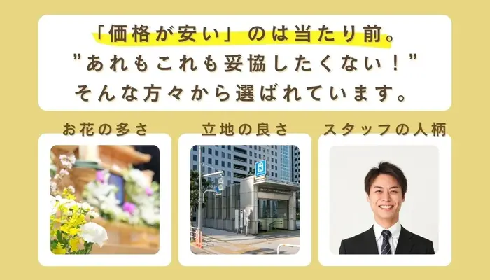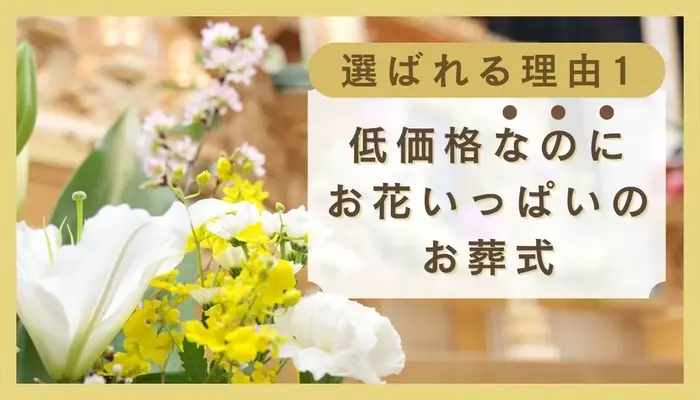 「他社は価格は安かったけど、不満や後悔が残っています」そんな人たちから選んでいただくことが多い当社。低価格でできる葬儀はたくさんありますが、祭壇や従業員の品質を落として「安かろう、悪かろう」になっている葬儀もあります。当社は、「低価格」であることは当たり前。お花の仕入れや祭壇の制作を自社で完全内製しているので、「低価格なのに、美しくボリュームのある祭壇」で大切な人を見送ることができます。