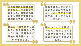 葬儀をお手伝いしたお客様からいただく弊社のアンケートにはほ必ずと言っていいほど、「丁寧」「明確」「スピーディ」という言葉が多く並んでいます。弊社では、大手百貨店の接客責任者を務めていたスタッフを招き入れ、高い接客水準を満たしたスタッフだけが応対させていただく認定制度をとっています。また、葬儀後にご相談の多い「遺言」や「相続」についても親身に相談に乗らせておいただいておりまして、大変ご好評をいただいております。