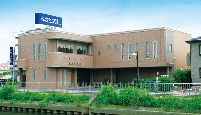 みさと式礼は大場川沿いのミニストップ三郷谷中店から徒歩1分のところにあります。最大100名程収容できる式場は、家族葬から一般葬まで幅広く対応。面会できる安置設備も備えています。
