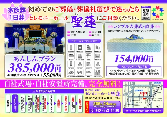さいたま市北区にある「セレモニーホール 聖蓮」は、式場使用料無料という明快な料金体系に加え、地域に根差した運営を行っています。お車の方も駐車場が用意され、電車でのアクセスも良好で、ご参列される方の負担が少ないのも大きな特徴です。地元だからこそ分かる配慮と、無理のない費用で、ご家族も参列者も安心してご利用いただけます。