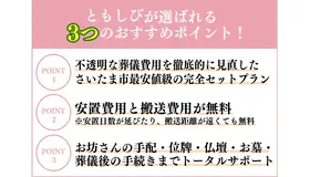 93,500円〜【さいたま市最安値級】の通夜・告別式を行わずに火葬のみ行うプランです。費用をできるだけ抑えて慎ましくお見送りをしたいという方によく選ばれています。 ※火葬当日まで何日間でも安置料金が無料。距離や回数によって通常は金額が変動する、ご搬送料金も一切無料の当社特典つき。