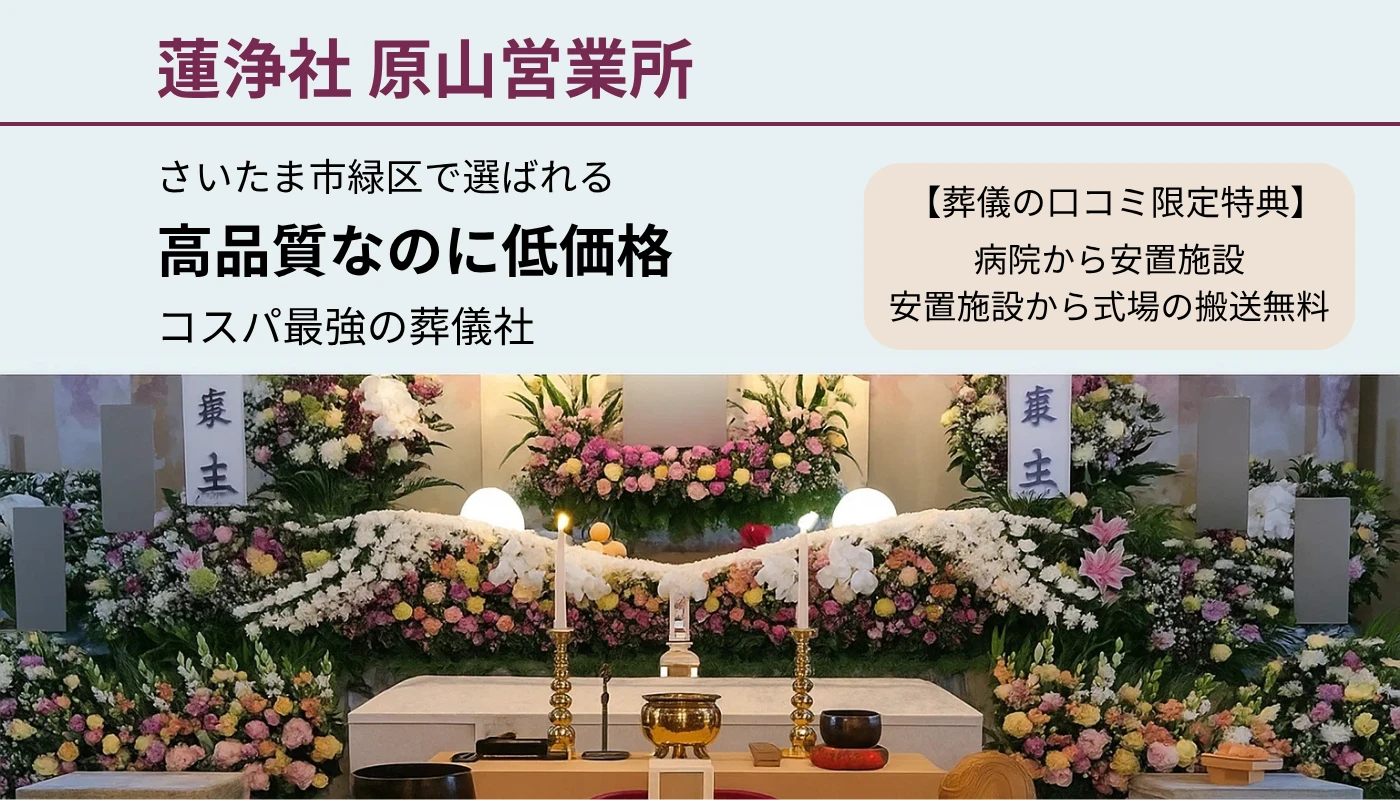 蓮浄社 原山営業所は、越谷浦和バイパスやケーズデンキ浦和原山店のすぐ近くにあります。自社式場を持たず、そこにかける運営費を家族に還元。そして担当してくれるのは業界歴20年以上の大ベテラン。安心して任せられると評判の葬儀社です。