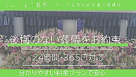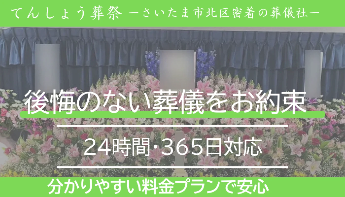 「てんしょう葬祭」はさいたま市北区にある葬儀社です。お客様に安心してご利用いただけるよう、必要なものがすべて含まれた葬儀プランをご用意しております。分かりやすい料金プランでお客様に納得いただける葬儀をご提供しております。さいたま市で葬儀をご検討中の方はぜひ一度ご相談ください。