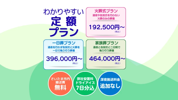 さいたま葬儀サポートでは、さいたま市の病院・施設のお迎え限定で、安心の「定額制プラン」をご用意しております。 一般的に、葬儀の費用はご逝去から葬儀当日までの日数が長くなると、「ご安置料金」や「ドライアイス費用」などが追加になる場合があります。また、病院や施設からの搬送距離が長い場合や、深夜・早朝のお迎えになると、「搬送費用」や「深夜料金」などが別途かかることも珍しくありません。 こうした不透明でわかりにくい追加費用をなくすために、私たちは明瞭な定額制プランを作りました。ご希望のオプションを除き、必要最低限のものはプランに含まれておりますので、安心してご利用いただけます。 また、さいたま市外の病院や施設のお迎えも、少ない追加の費用でご案内できますので、詳しくはお電話でお問い合わせください。 ご葬儀に関するご不安を少しでも軽減できるよう、わかりやすく・丁寧にご案内いたします。どうぞお気軽にご相談ください。