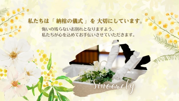 人生のなかで最も繊細な時間に関わらせていただくこと。それは責任の重い仕事であると同時に、人と人との信頼とぬくもりが支えとなる、かけがえのない仕事でもあります。私たちはその誇りを胸に、ご家族の気持ちに寄り添いながら、心から安心してお見送りいただけるよう努めております。