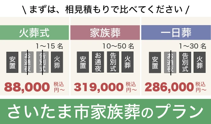 | 料金 | 直葬・火葬式 :¥88,000〜(税込) 一日葬 :¥286,000〜(税込) 家族葬 :¥319,000〜(税込) |