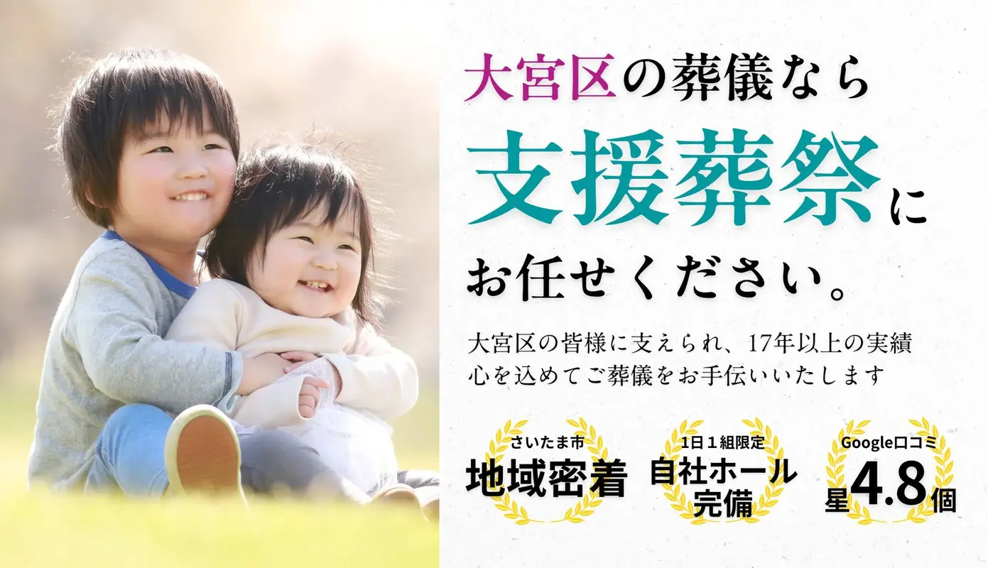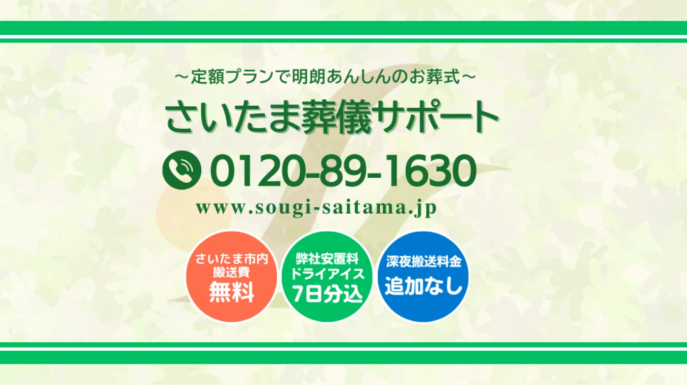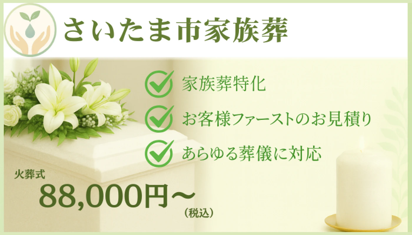 さいたま市大宮区の【おおみや葬祭事業サービス】では、家族葬プラン18万円~や火葬式9万円~にて、丁寧なお見送りをサポートいたします。24時間365日対応で、安心してご相談ください。