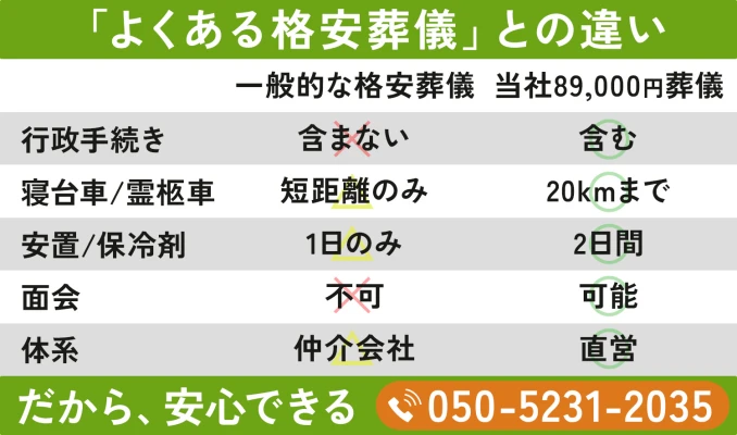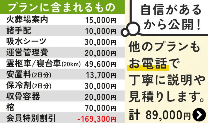 | 料金 | 直葬・火葬式 :¥97,900〜(税込) 一日葬 :¥320,293〜(税込) 家族葬 :¥342,293〜(税込) |