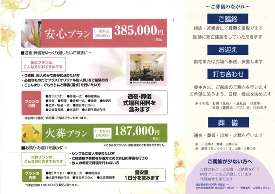 料金 | 直葬・火葬式 :¥99,000〜(税込) 直葬・火葬式 :¥165,000〜(税込) 一日葬 :¥286,000〜(税込) 一日葬 :¥330,000〜(税込) |