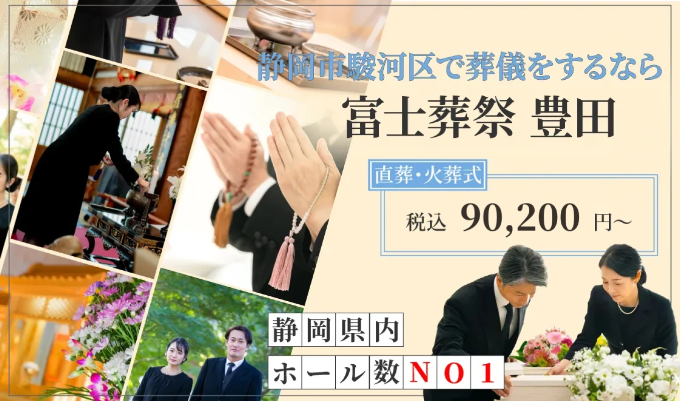 「富士葬祭 豊田」は静岡市駿河区豊田にある葬儀場です。「富士葬祭 豊田」は、静岡市駿河区に密着した葬儀社です。 JR静岡駅からも近く、交通の便の良い立地です。 1日1件のホール・会館の貸切となりますので、ゆとりをもってご利用いただくことができます。 経験豊富なスタッフが、あなたの状況や希望に合わせた葬儀をご提案いたします。経験豊富なスタッフが担当いたしますので、安心してお任せください。